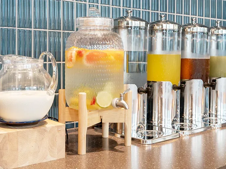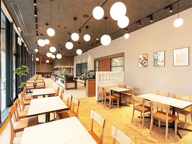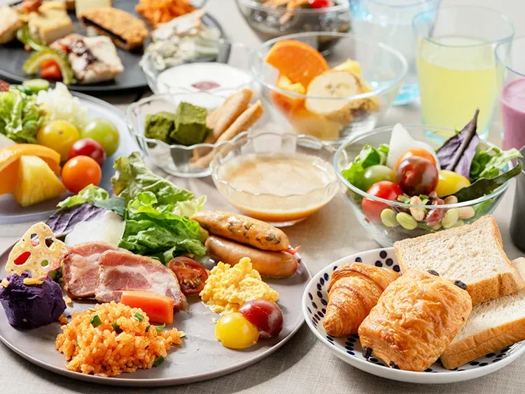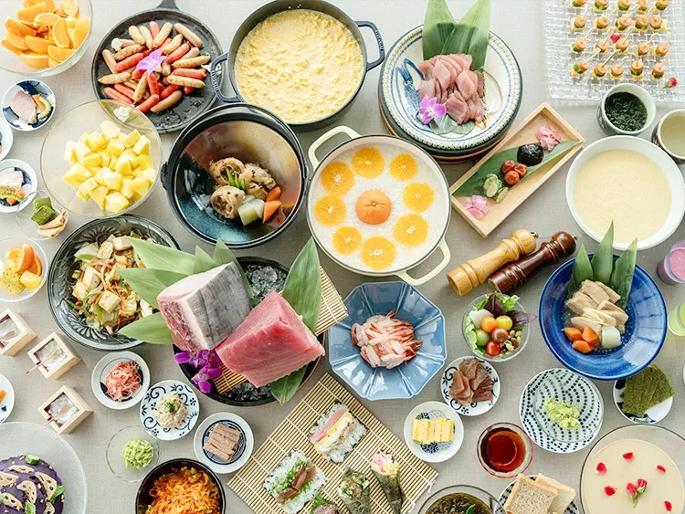 「レストラン楔」では琉球時代から受け継がれた食文化と、日本の和食文化を融合させた創作料理を、ビュッフェスタイルの朝食でご提供します。 肉や魚のカービングサービス(※)や揚げたて沖縄天ぷらなどを目の前で調理するほか、沖縄県産マグロの手巻き寿司、シークワーサーなど柑橘類を使用した雑炊、紫芋のポテトサラダなど魅力的な料理を沖縄の焼き物「やちむん」の器で演出します。 ※大きな肉の塊をシェフが目の前で切り分けるサービスのこと