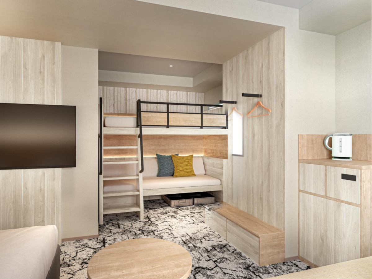 The renovated rooms will have a warm wood-grained interior. And we will add twin rooms and create new rooms such as king size bed rooms and the rooms with bunk bed.